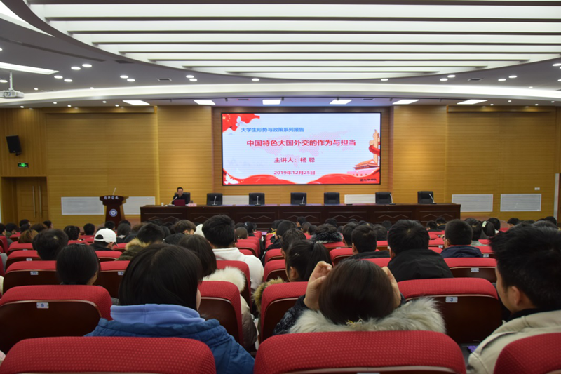 12月25日下午,党委副书记杨聪在教四报告厅以“中国特色大国外交的作为与担当”为题,为400余名师生讲授形势与政策课。杨聪书记从三方面进行了详尽细致的阐述:中国外交所取得历史性成就,中国外交的优良传统和鲜明特色,以及开创新时代中国特色外交新局面。通过深入剖析,引发师生对“推动构建人类命运共同体”、“一带一路”等问题的思考。最后,鼓励学生要勇于承担使命,接续奋斗,为实现中华民族伟大复兴的中国梦而不懈努力。