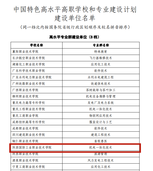 12月10日,教育部、财政部公布了中国特色高水平高职学校和专业建设计划建设单位。学校成功入选“双高计划”高水平专业群建设单位(B档)。下一步,学校将以习近平新时代中国特色社会主义思想为指导,遵循“创新、协调、绿色、开放、共享”五大发展理念,以国家职业教育改革、国防科技工业军民融合深度发展、军工企业转型升级为契机,以立德树人为根本,以改革创新为动力,以产教融合为主线,以服务军工为宗旨,以质量提升为目标,以“三全育人”为抓手,着力培养“忠诚报国,敬业奉献;博学多才,修身求索;热爱军工,能高技强;坚韧弘毅,追求卓越”具有国防职教精神的高素质军工特质技术技能人才,为国防科技工业发展和经济社会发展提供强有力的人力支撑。同时通过实施中国特色高水平专业建设项目,着力打造机电一体化技术专业群,形成军工特色显著的专业群建设新范式,努力使专业群综合实力位列全国前茅,成为职业教育的中国品牌。