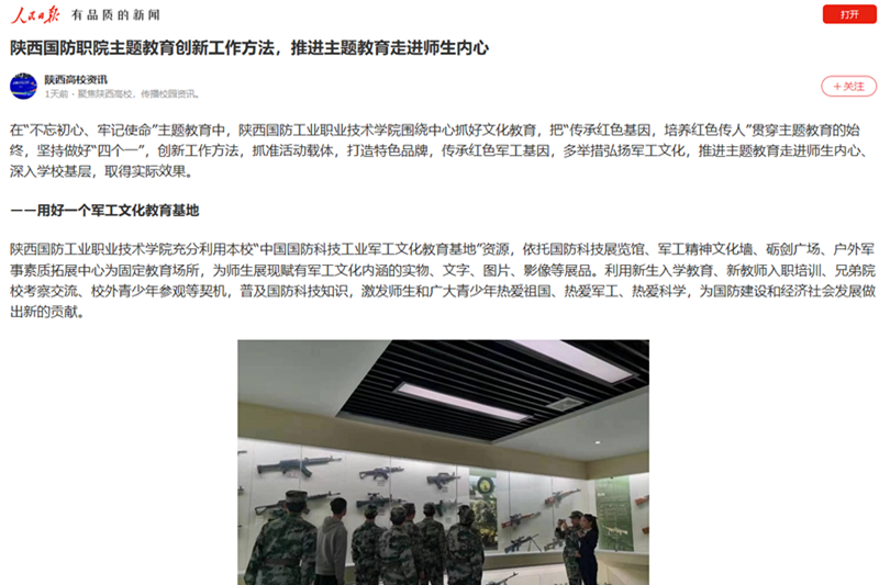 自主题教育开展以来,学校坚持围绕军工办学特色和学校实际做文章,坚持把红色军工文化育人融入主题教育,将“传承红色基因”贯穿始终,把主题教育转化为凸显学校军工文化特色的助推器,开创了学校立德树人新局面。同时,学校将主题教育中形成的一些好做法、好制度、好经验转化好、坚持好,推动学校高质量发展。