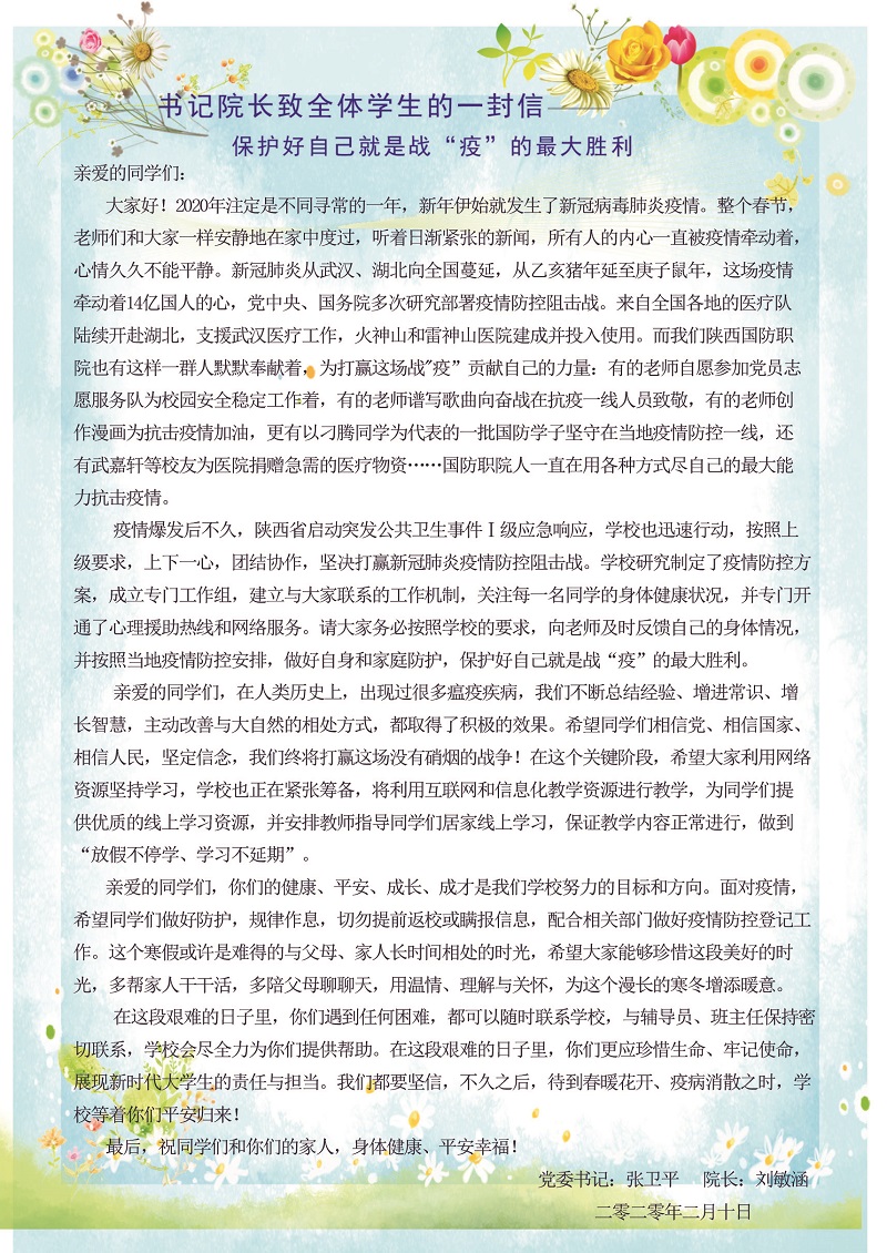 疫情爆发后不久,陕西省启动突发公共卫生事件Ⅰ级应急响应,学校也迅速行动,按照上级要求,上下一心,团结协作,坚决打赢新冠肺炎疫情防控阻击战。学校研究制定了疫情防控方案,成立专门工作组,建立与大家联系的工作机制,关注每一名同学的身体健康状况,并专门开通了心理援助热线和网络服务。请大家务必按照学校的要求,向老师及时反馈自己的身体情况,并按照当地疫情防控安排,做好自身和家庭防护,保护好自己就是战“疫”的最大胜利。