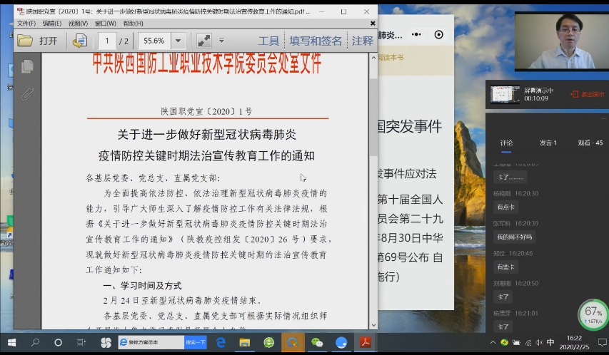 党支部书记党威武通过直播首先为各位党员汇报了自新冠肺炎疫情发生以来,党、国家以及陕西省对疫情的防控具体情况,强调了陕西省政府和陕西省防控领导小组对各高校疫情防控工作的具体安排和部署,同时重点汇报了防疫期间我校党委的各项工作部署,并对全体教职工提出了具体要求,说明了具体学习要求。
