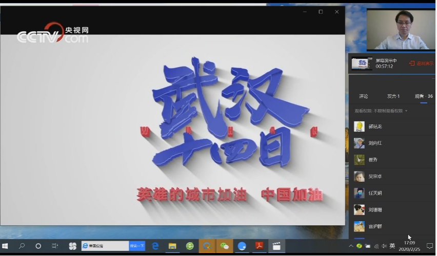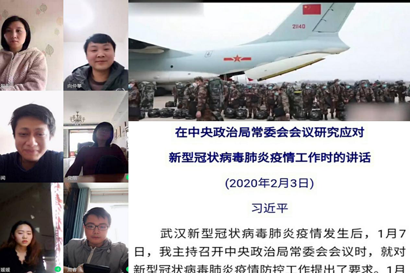第三阶段,大家集中观看了《习近平总书记在中央政治局常委会会议研究应对新型冠状病毒肺炎疫情工作时的讲话》《你的样子》《习近平讲述的故事——战“疫”必胜》和《〈武汉十四日〉英雄的城市,你定能过关!》等视频。