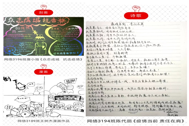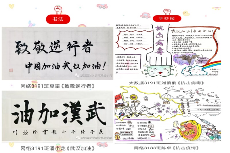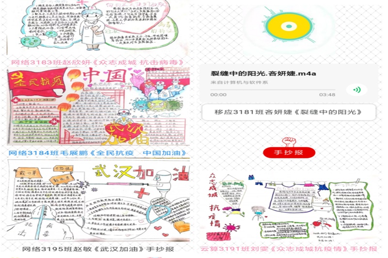 此次活动得到了广大学生的热烈响应,各班级的学生也利用身边的设备、媒体、笔墨等素材,积极通过手语、书法、视频、手抄报和说唱等形式为疫情防控加油,为中国加油,为武汉加油,表达了对众志成城必定战胜疫情的信心。