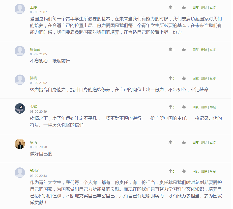 马克思主义学院髙翊凯说:“中国共产党建党近百年的历史,就是一部全心全意为人民服务、团结和带领全国各族人民追求美好幸福生活的历史。我们要坚定“四个自信”,永跟党走,为实现“两个一百年”奋斗目标和中华民族伟大复兴事业而不懈努力!我们相信,英雄的中国人民在伟大的中国共产党的带领下,一定能够早日战胜这次新冠疫情。”