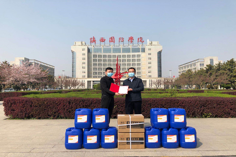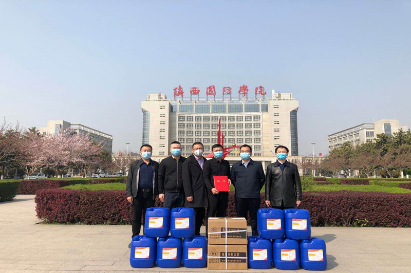 2020年3月23日上午,陕西德信观海信息技术有限公司总经理花英杰一行代表公司向我校捐赠了84消毒液1吨、一次性医用外科口罩2000只,助力我校疫情防控工作。副院长、疫情防控工作领导小组副组长张永军、教务处和医务所的相关负责同志参加了捐赠活动。