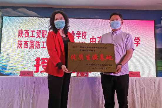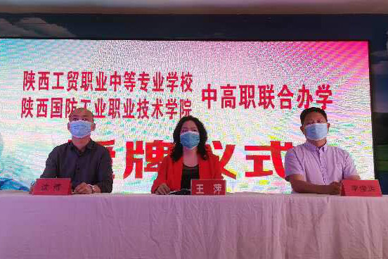 最后,由陕西工贸职业中等专业学校校长王萍和机械学院院长李俊涛进行了“中高职联合办学——优质生源基地”揭牌仪式。