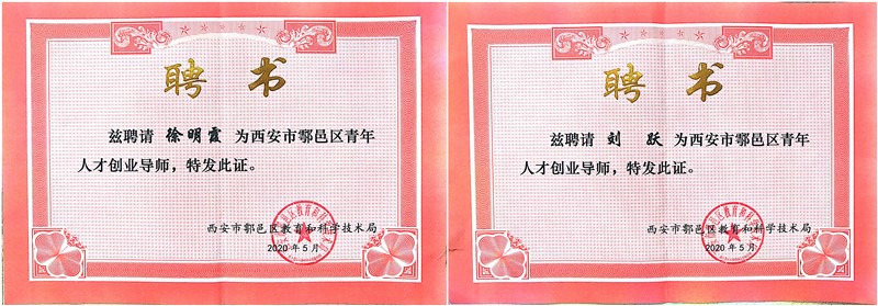 我校徐明霞和刘跃两位教师被聘为鄠邑区创业导师,由区委组织部副部长王雅颁发聘书,王雅副部长对我校创新创业工作所取得的成绩、经验和特色给予了高度肯定,希望我校教师能够积极发挥专业技术特长,实现高校科技成果就地转移转化,服务于地方经济建设。