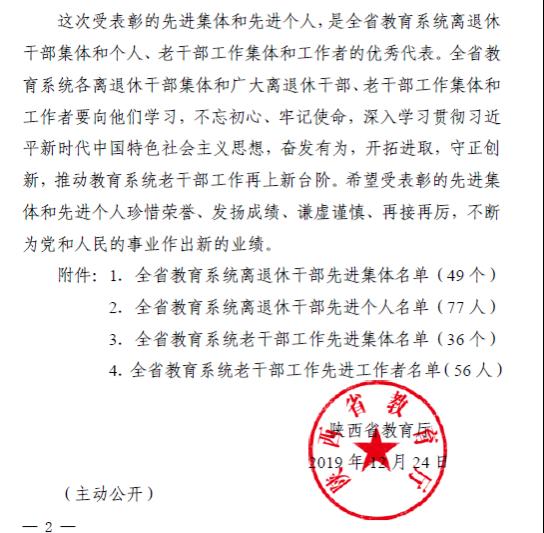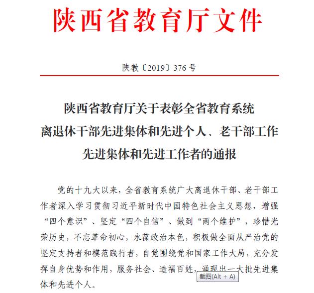 我校离退休党总支第二党支部荣获“陕西省教育系统离退休干部先进集体”荣誉称号;退休职工郑斌栋同志荣获“陕西省教育系统离退休干部先进个人” 荣誉称号;陈正权、吴宗卓两位同志荣获”陕西省教育系统老干部工作先进工作者”荣誉称号。
