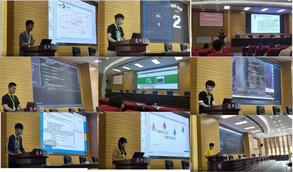 会议首先进行学生成果展示,基地有企业SaaS开发、游戏开发、微信小程序开发、大数据应用开发、机器学习6个工坊,经过同学们的充分准备、工坊企业+校内老师最终筛选出车友圈、超级吃豆人、差旅小程序、豆瓣电影、Web汽车管理系统、天天生鲜、健康计步器等9个项目组进行展示。