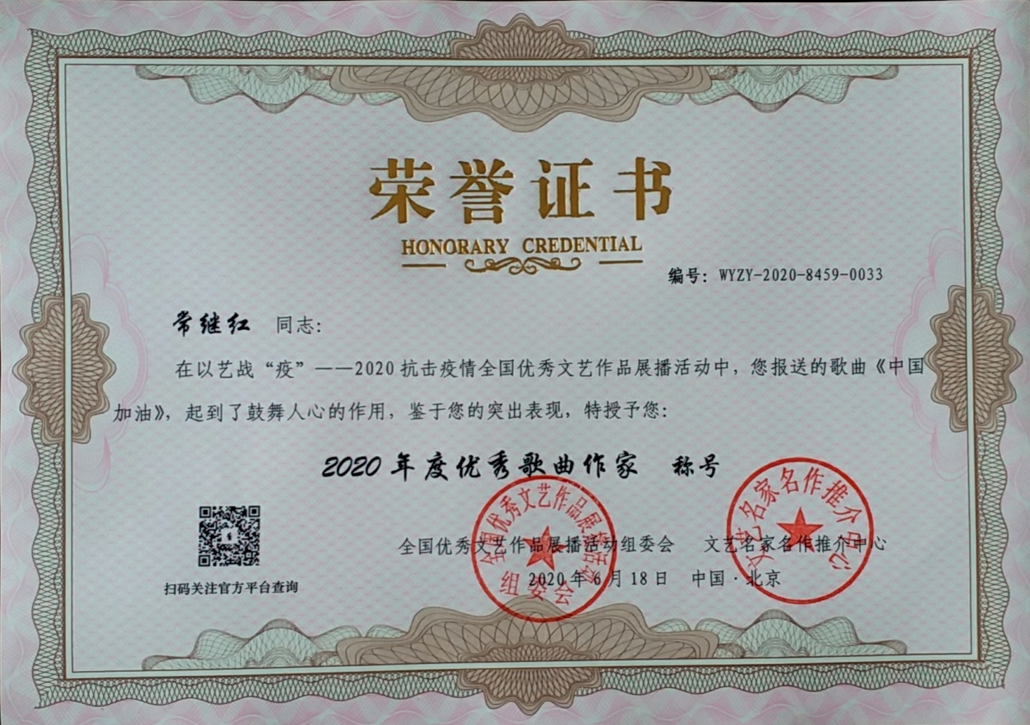 该教师在疫情期间创作的歌曲《中国加油》,参加了由2020年全国优秀音乐作品展播活动组委会等联合举办的以艺战“疫”——2020抗击疫情全国优秀文艺作品展播活动,并荣获“2020年度优秀歌曲作家”称号。这首抗击疫情公益歌曲是常继红老师奋战40多小时完成的艺术成果,作品音乐动人、旋律温暖、歌声诚挚,感人至深,充满了正能量。作品刚刚出炉就被腾讯视频、西瓜视频、今日头条、西部网、职教之音(教育部职成司官微公众号)、中国职业教育(中国职业技术教育网同步媒体)、陕西先锋(中共陕西省委组织部官微公众号)等各大媒体纷纷报道转载。
