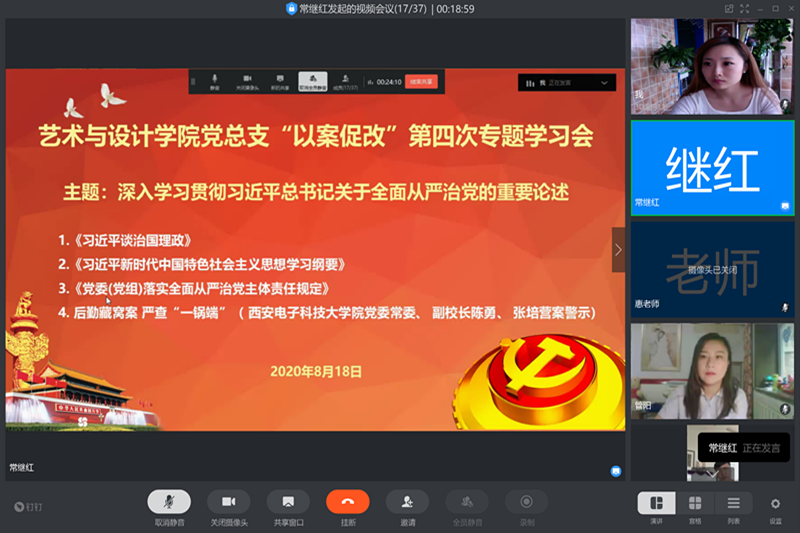 【艺术与设计学院党总支】根据学校《关于切实做好肃清赵正永流毒和以案促改专题学习教育工作安排的通知》(陕国职案改组〔2020〕3号)文件要求,2020年8月18日下午3点,艺术与设计学院党总支采取线上网络视频会议形式组织全体师生党员围绕“深入学习贯彻习近平总书记关于全面从严治党的重要论述”主题集中开展了“以案促改”第四次专题学习会,会议由艺术与设计学院党总支书记常继红主持。首先,常继红带领大家学习了《习近平谈治国理政》第三卷中《坚持和加强党的全面领导》相关内容。他强调,全体党员要深刻领会坚持和加强党的全面领导,首先要维护党中央权威和集中统一领导,坚持思想建党、理论强党,坚持学思用贯通、知信行统一,旗帜鲜明、立场坚定,不断增强“四个意识”、坚定“四个自信”、做到“两个维护”。党员、干部不论做什么工作、级别多高,都是党的干部、组织的人,要牢记第一职责是为党工作。艺术与设计学院院长管阳带领五位党员同志领学了《习近平新时代中国特色社会主义思想学习纲要》中第二章《当代中国发展进步的根本方向》全部内容。管阳强调,作为共产党员,要在多思多想、学深悟透上下功夫,在系统全面、融会贯通上下功夫,在知行合一、学以致用上下功夫。维护中国共产党的领导,坚持马克思主义同中国实际和时代特征相结合,坚持改革开放,坚持走新时代中国特色社会主义道路,为学校的改革和发展贡献自己的力量。党总支宣传委员刘倩带领大家学习了《党委(党组)落实全面从严治党主体责任规定》。她表示,我们要认真领会、落实全面从严治党的主体责任精神,必须保持战略定力,发扬斗争精神,不断深化自我,一以贯之、坚定不移和党中央保持一致。最后常书记结合《后勤藏窝案严查“一锅端”——西安电子科技大学原党委常委、副校长陈勇、张培营案警示》警示案例,警示全体党员,要严格遵守党纪党规,坚守初心使命,不踩红线、严守底线,始终保持对纪律和制度的敬畏之心,确保自身正、自身硬。