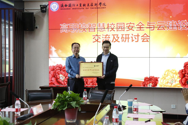 深信服公司陕西区主管袁铮作为参会专家对杨院长的热烈欢迎表示感谢。袁铮主管介绍了通过管理自动化、教学数字化、创新智慧化、数据中心云化四大维度来构建智慧校园IT基础设施,助力高校信息化的云化建设。随后进行了授牌仪式,由深信服公司授于我校“安全运营中心示范院校”。