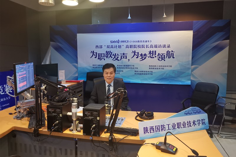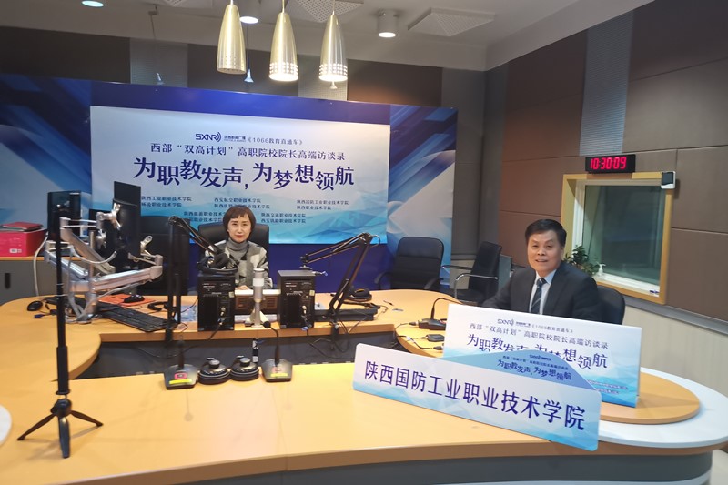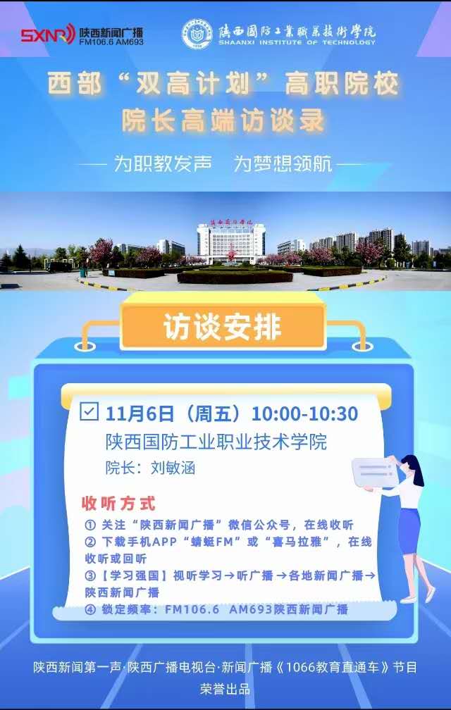 为全面推动西部高等职业教育高质量发展,不断提升新时代职业教育现代化水平,陕西广播电视台·新闻广播1066《教育直通车》推出特别策划:西部“双高计划”院长书记访谈录。11月6日上午10点至10点半,我校校长刘敏涵受邀走进节目直播间,为职教发声、为梦想领航。