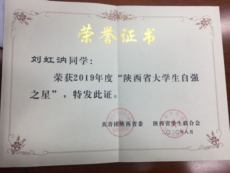 据悉,全国寻访“中国大学生自强之星”活动自2007年启动,每年评选一次,已连续举办了13届。2019年度寻访“中国大学生自强之星”活动经高校推荐、省级初评、全国评审等环节,寻访出一批在爱国奉献、道德弘扬、科技创新、自立自强等方面具有突出事迹,在当代大学生中能起到榜样引领作用的自强典型。校团委高度重视大学生自强之星的选拔培育工作,通过精心组织、广泛动员宣传,挖掘出了一大批自强自立的优秀学子。经学校、团省委、团中央多级评审、层层选拔,刘虹汭同学成功当选。
