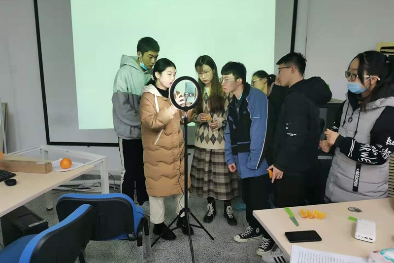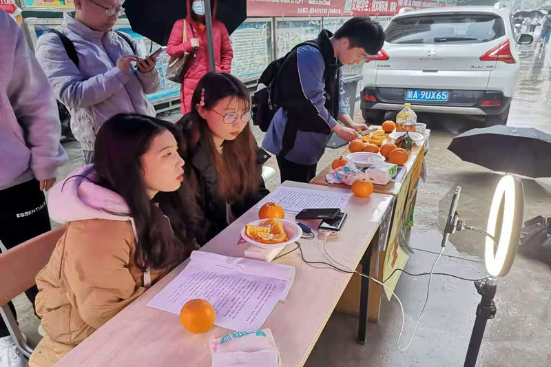 活动当天,秋雨连绵,我校直播团队师生冒雨从鄠邑区前往西邮雁塔校园。直播前,我校师生给西邮电商专业部分同学做了简短直播带货培训。中午12点,我校和西邮的两位学生主播准时上播,他们从直播背景、产品特点、主要优势、用户评价等多方面详细地介绍巴东脐橙,吸引了大量粉丝观看,主播助理们也卖力宣传,引导经过的师生品尝橙子进入直播间点赞。活动持续进行了三个小时,获得两校师生的广泛关注和支持。