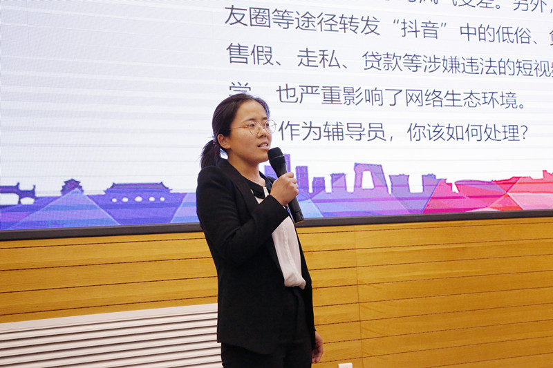 在案例分析环节中,选手们充分利用专业知识和相关经验,对案例进行剖析,从案例中问题的关键点、解决思路、实施方法以及启示等方面进行分析阐述;在理论宣讲环节,辅导员面向学生,用通俗易懂的语言开展对马克思主义理论、习近平新时代中国特色社会主义思想、党的十九大精神等的宣传阐释,引起现场师生共鸣;在谈心谈话环节,参赛选手沉着应对,理性分析,机智应答,在短短6分钟内既找到问题本质,还要给出合情合理的解决方式或建议,你来我往的思想交锋和机敏智慧的对话,赢得了在场评委和观众的阵阵掌声。