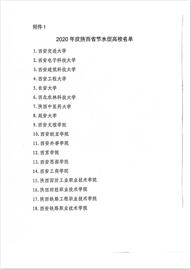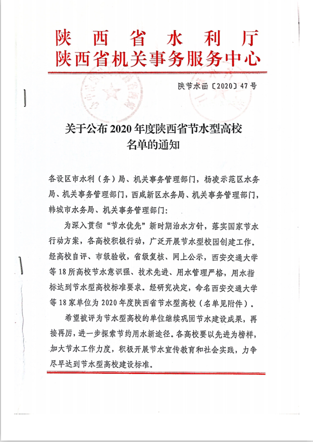 近日,陕西省水利厅、陕西省机关事务服务中心联合发文公布了包括我校在内的18所高校为首批陕西省“节水型高校”,这是我校在习近平新时代中国特色社会主义思想指导下,积极践行和落实习近平总书记提出的“节水优先”方针中取得的又一重大成果。