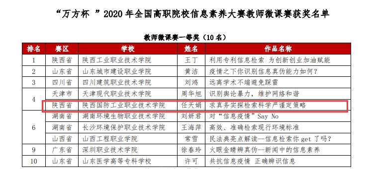 本届大赛来自全国27个省(自治区、直辖市)的参赛院校达715所, 教师微课赛通过各省选拔赛向大赛组委会推荐119个作品,我校图书馆任天娟老师提交的作品《求真务实探检索科学严谨定策略》从全国参赛作品中脱颖而出,荣获国赛“一等奖”。