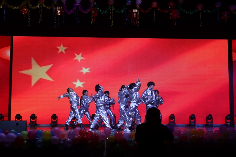 萨克斯演奏《我只在乎你》,优美的乐曲伴随着优雅的舞蹈,引发同学们一次又一次的掌声;表演者声情并茂地朗诵《可爱的中国》,表达了对中国母亲的热爱;舞蹈《飞天》,舞者婀娜地舞姿带领观众梦回大唐,游历敦煌,领略飞天的神韵,又契合了嫦娥五号飞天登月的重大意义;歌伴舞《失恋阵线联盟》处处洋溢着我校学生的青春活力;小品《疫声F.M》以抗击疫情为背景,通过深情地表演向最美逆行者和抗疫英雄致敬;歌曲《精忠报国》伴随着慷慨激昂的音乐、刚劲有力的武术和赵景隆同学挥洒自如地书写“精忠报国”四个大字,深深地震撼了现场观众;古典舞《九儿》以舞者优美的身姿、轻盈的舞步充分地表现出舞蹈独有的韵味和魅力,用无声的语言感化了观众;张浩辰、徐瑞超老师带来的传统相声《八扇屏》,流利的贯口引发观众阵阵喝彩;乐队表演《曾经的你》,跳动的音符震撼全场;爵士舞《Worth it》用火热的舞姿再次引爆了现场观众的掌声、欢呼声、尖叫声;说唱《飘向北方》,将盛典的激情推向顶点。最后,在全体老师合唱《我和我的祖国》的旋律中圆满落幕。