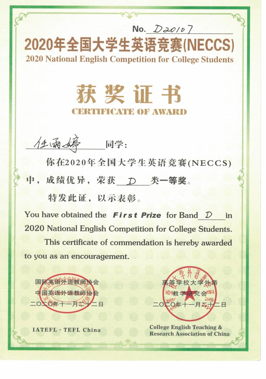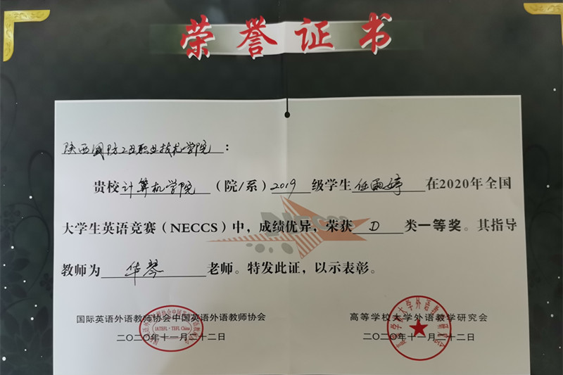 2020年11月22日全国大学生英语竞赛决赛在西安电子科技大学举行,我校组织学生参加D类比赛,计算机学院网络3191班学生任雨婷喜获全国一等奖,指导教师为外语教研室华琴老师。我校学生在本届全国大学生英语D类比赛中共获奖项15项,其中一等奖1项,二等奖5项,三等奖9项目。