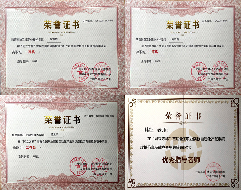 12月25日-27日,2020全国虚拟现实与工业可视化教育技术研究研讨会暨“同立方杯”首届全国职业院校自动化产线装调虚拟仿真技能竞赛颁奖典礼礼在山东日照召开,我校人工智能学院韩征、张海潮两位老师参加本次会议并代表学校领奖。本次比赛我校共获得全国一等奖2项,二等奖1项的好成绩,韩征老师获得“优秀指导老师”荣誉。