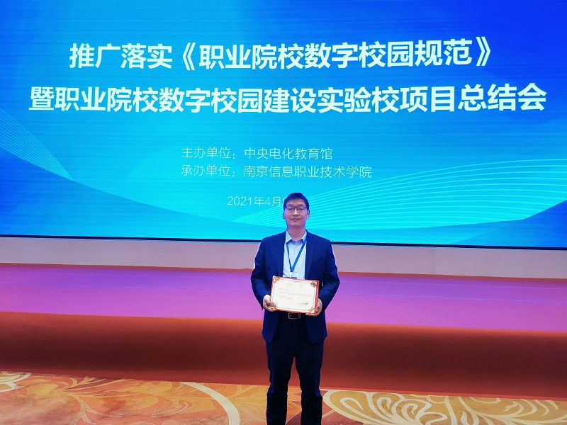 2021年4月8日,由中央电化教育馆主办、南京信息职业技术学院承办的“推广落实《职业院校数字校园规范》暨职业院校数字校园建设实验校项目总结会”在南京召开。教育部职业教育与成人教育司、中央电化教育馆有关负责同志出席了会议,来自全国260余所职业院校,部分省(自治区、直辖市)教育厅高等教育处、职业教育与成人教育处和省级电教馆(中心)的有关负责同志共400余名代表参加了会议。我校网络中心主任徐华宇老师参加了本次会议,荣获“职业院校数字校园实验校工作成绩突出个人”称号。