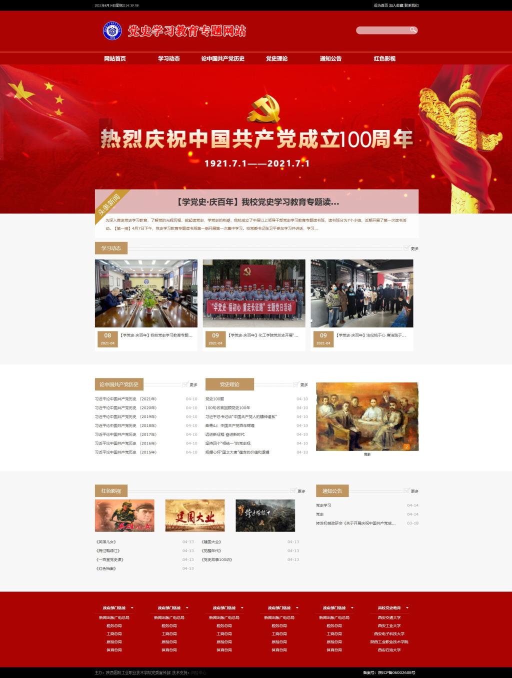 学校党史学习教育专题网站以红色为主基调,下设学习动态、论中国共产党历史、党史理论、通知公告、红色影视等栏目。网站以图片、文字、视频等多种形式全面展示学校党史学习教育的工作进展,满足学校党员干部师生多样化的学习需求,引导广大师生学史明理、学史增信、学史崇德、学史力行,做到学党史、悟思想、办实事、开新局。