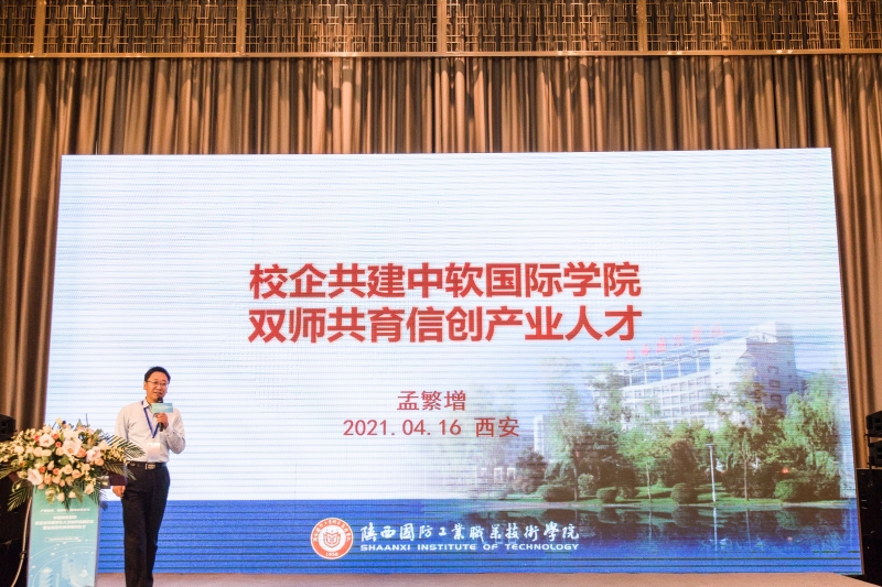孟繁增代表我校在会上作了题为《校企共建中软国际学院,双师共育信创产业人才》的专题报告。首先介绍了我校根植国防,立足陕西,联合军工企事业单位开展全方位、深层次校企合作,将军民融合贯穿到教育教学改革的全过程,构建了以陕西国防工业职业教育集团为主体,以校企协同发展联盟、现代产业学院、协同创新中心为三翼的“一体三翼”军民融合平台,全面提升学校人才培养、技术技能积累、服务经济社会发展等内涵指标,打造校企合作命运共同体,形成产教融合新生态。