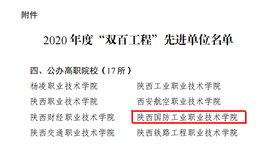 根据《“双百工程”工作成效考核办法》(陕高教〔2017〕17号)和《关于开展“双百工程”2020年度考核工作的通知》(陕教工统办〔2020〕9号),省委教育工委、省教育厅对参加“双百工程”的全省103所高校2020年度工作进行了考核。近日,印发了《关于表彰2020年度“双百工程”先进单位的通报》(陕教工〔2021〕109号),我校作为受表彰的院校之一,荣获了2020年度“双百工程”工作先进单位荣誉称号,这也是陕西高校开展结对帮扶“双百工程”以来,我校连续四年获得年度先进单位荣誉称号。