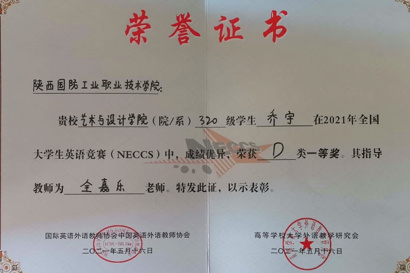 近日,全国大学生英语竞赛决赛在西安电子科技大学举行,我校组织学生参加D类比赛,艺术与设计学院图形3203班学生乔宇喜获2021年全国大学生英语竞赛D类一等奖,指导教师为外语教研室全嘉乐老师。我校学生在本届全国大学生英语D类比赛中共获奖项13项,其中一等奖1项,二等奖4项,三等奖8项。