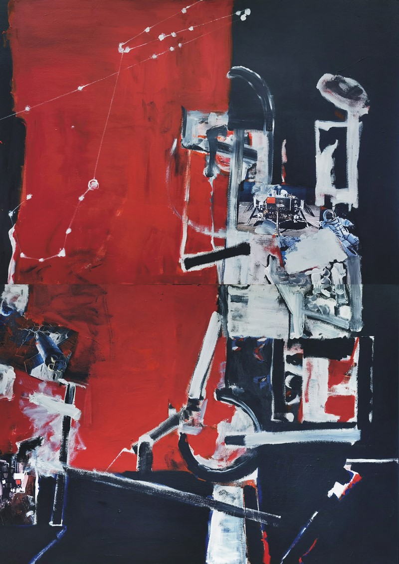 惠晓钟油画作品《红穹》200cmX150cm,布面综合材料。该作品用抽象绘画加局部图片拼贴的方式,表达艺术家对我国未来太空探索的宏图愿景。