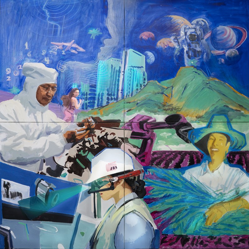 张志越《前行•虔行》200x200cm布面丙烯。作品以2035年远景目标为蓝本砥砺前行