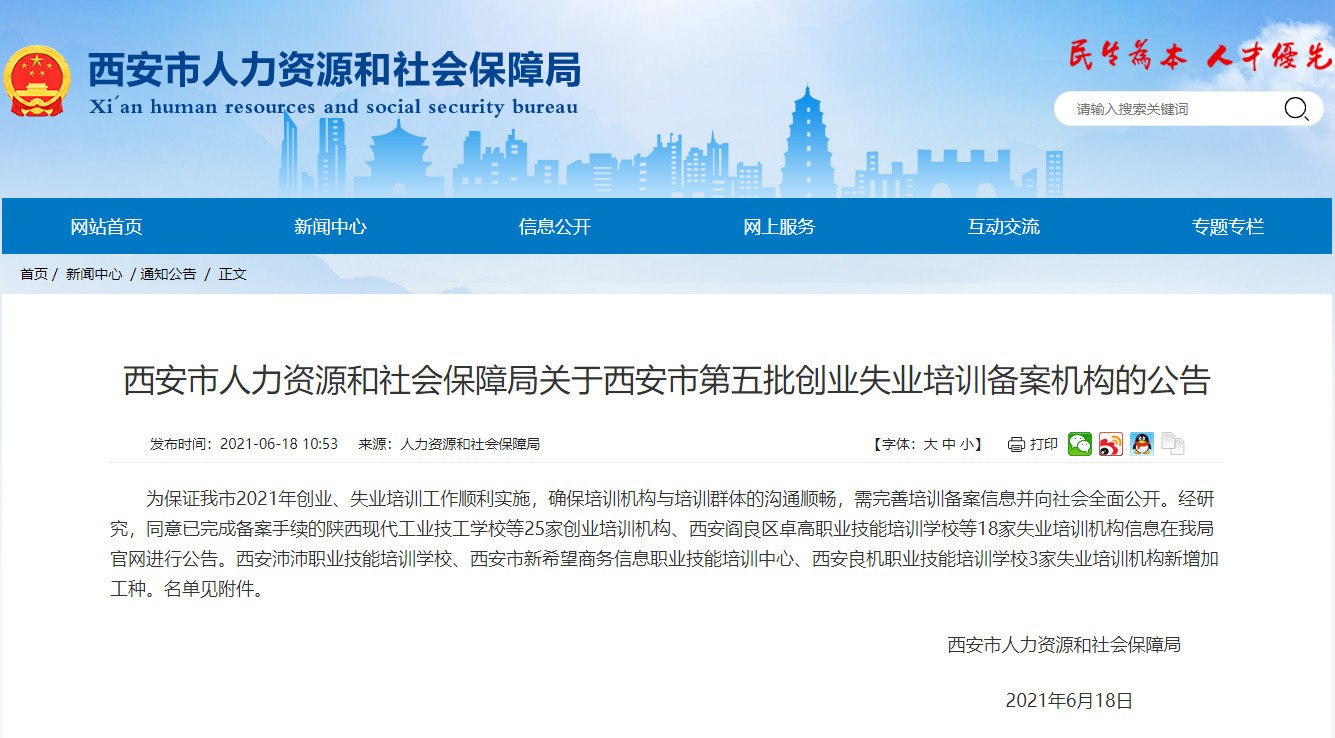 近日,西安市人力资源和社会保障局发布《关于西安市第五批创业失业培训备案机构的公告》,我校成功获批西安市创业、失业培训机构。