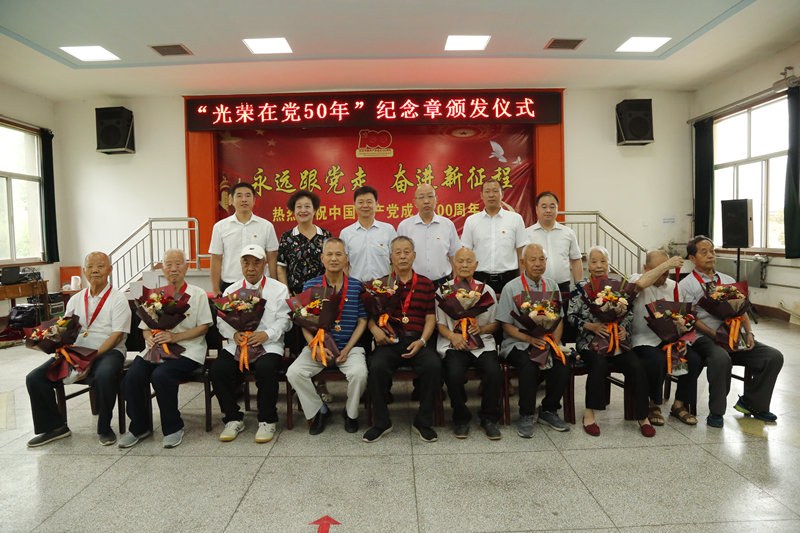 本次活动首先举行了“光荣在党50年”纪念章颁发仪式,仪式由离退休党总支副书记陈黛琴主持。仪式在雄壮的国歌声中拉开了帷幕,离退休党总支书记张瑞鹏从党员专题学习教育、党风廉政建设、常态化疫情防控工作、以及离退休管理处和社区管理服务工作等方面对党总支工作做了总结;党委组织部副部长程凯宣读了《荣获“光荣在党50年”纪念章党员名单》;张卫平、刘少阳为荣获“光荣在党50年”纪念章的14名党员颁发了纪念章和鲜花,并和他们合影留念。