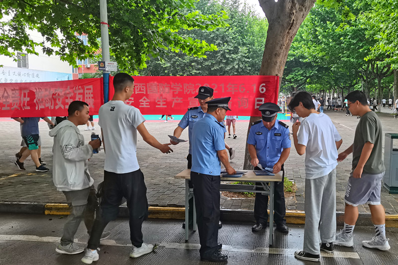 精心组织,开展安全宣传咨询日活动。邀请政法委、鄠邑公安分局、交警大队于6月16日在校园组织开展了全国安全宣传咨询日活动。对师生发放安全宣传资料、安全教育主题系列书签、赠送小礼品,现场解答师生在日常生活、工作中遇到的各类法律法规问题。广大师生积极创作安全生产微视频,宣传应急管理、安全防范技能,营造良好安全氛围。