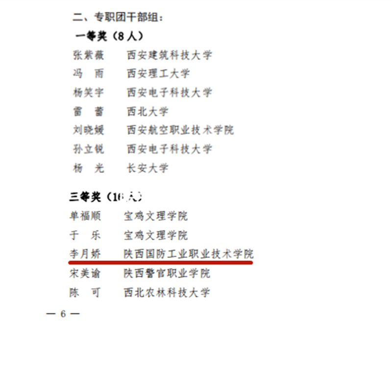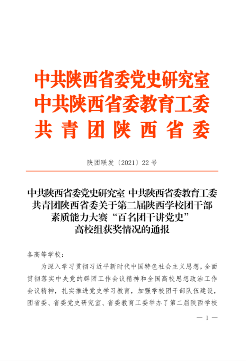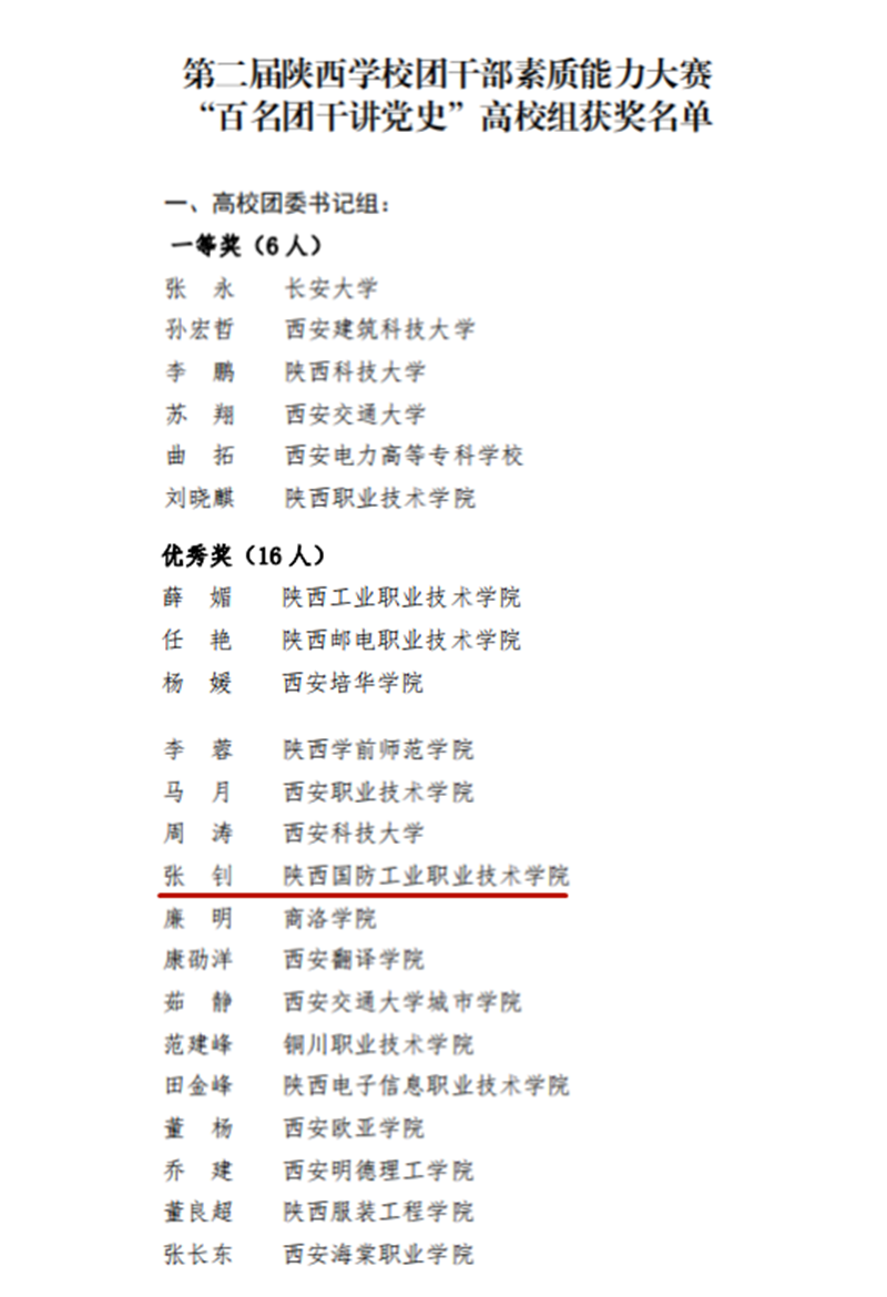 近日,由共青团陕西省委、中共陕西省委党史研究室、中共陕西省委教育工委主办的第二届陕西学校团干部素质能力大赛“百名团干讲党史”比赛(高校组)发布了获奖情况的通报。经过激烈角逐,我校团委书记张钊荣获高校团委书记优秀奖,李月娇老师荣获专职团干部组三等奖。