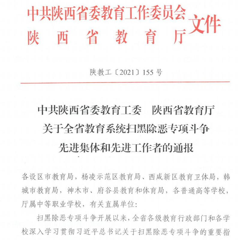 近日,中共陕西省委教育工委、陕西省教育厅发布《关于全省教育系统扫黑除恶专项斗争先进集体和先进工作者的通报》,决定对全省教育系统扫黑除恶专项斗争中表现突出的16个先进集体和29名先进工作者予以通报表扬,我校被评为“全省教育系统扫黑除恶专项斗争先进集体”。