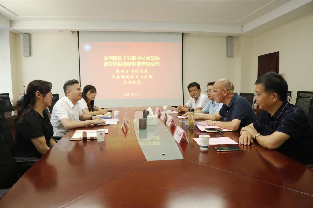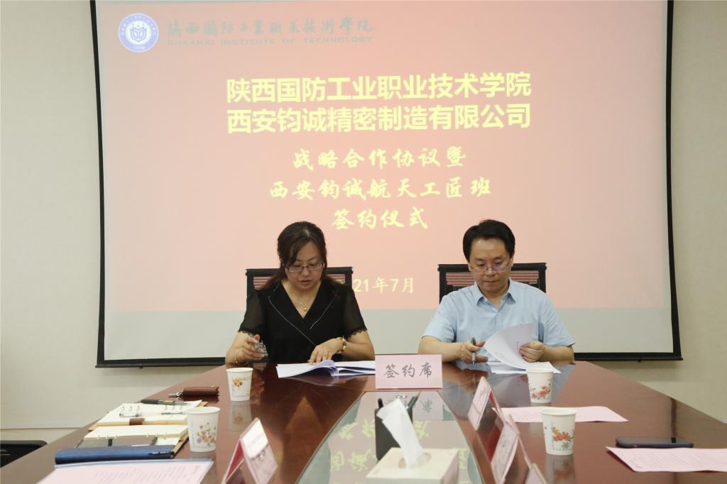 刘少阳副校长和贾建东副总经理代表校企双方,签订校企合作战略协议,我校校企合作处张俊勇与王艳红代表双方签署“西安钧诚航天工匠班”人才培养协议。