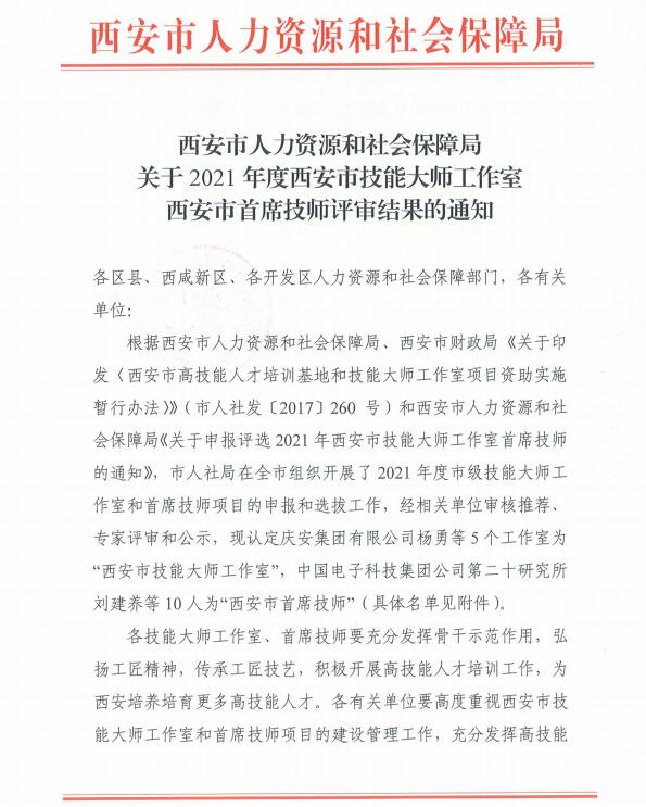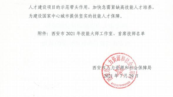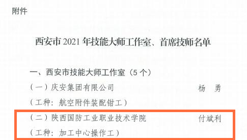 近日,西安市人力资源和社会保障局下发了《关于2021年度西安市技能大师工作室、西安市首席技师评审结果的通知》,我校申报的“付斌利技能大师工作室”获批西安市2021年技能大师工作室项目,成为西安市辖区首个获批此项目的高职院校。该项目是我校继“石雷省级技能大师工作室”后的第二个由政府批准的大师工作室项目。