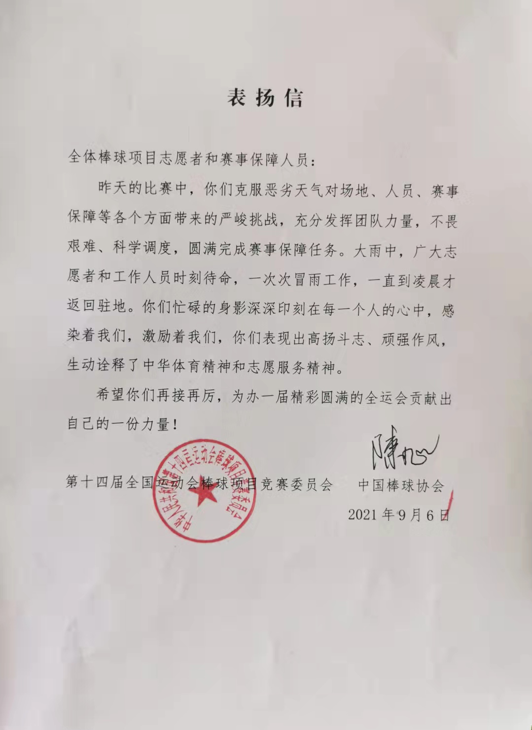 十四运组委会和棒、垒球竞赛委员会对我校志愿者给予了充足保障,在住宿生活、饮食日用等多方面为志愿者提供了便利条件,工作过后,一杯杯温热的姜汤驱散了志愿者们身上的寒意,老师们鼓励的话语温暖人心。