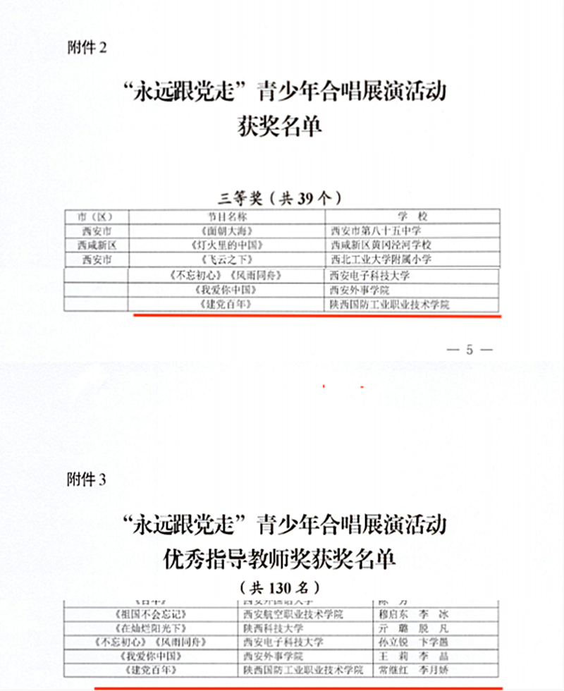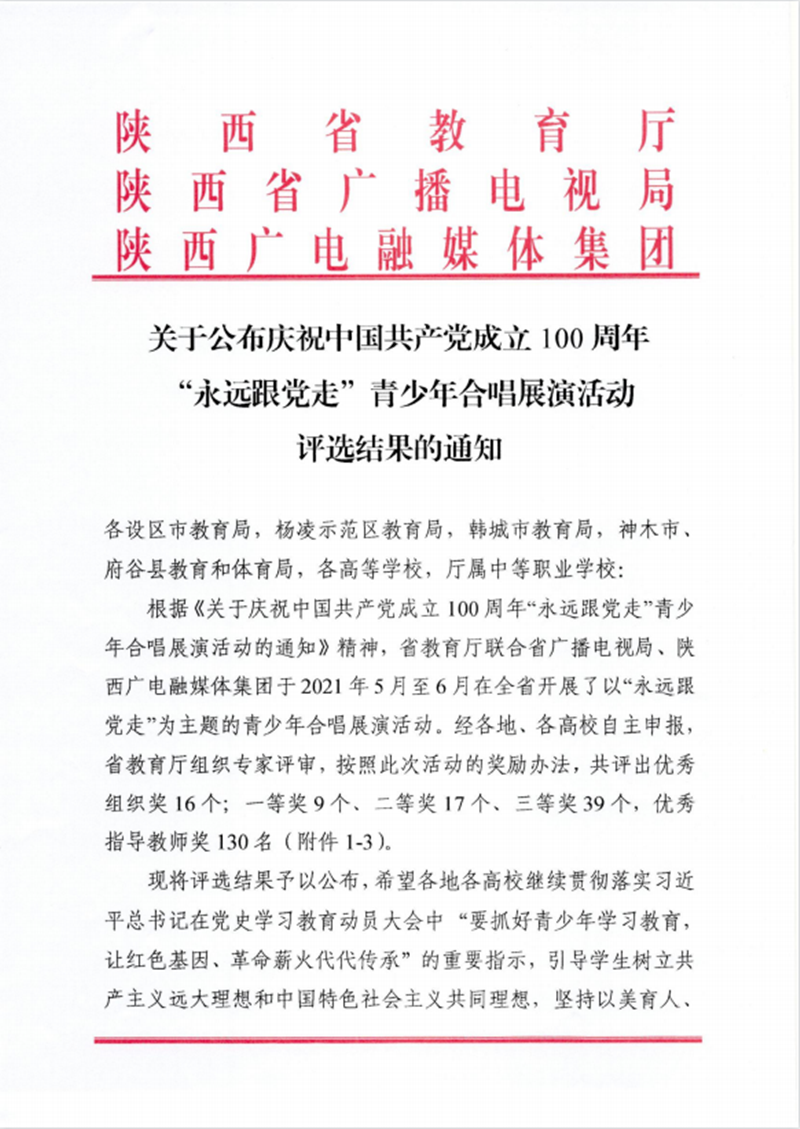近日,由陕西省教育厅、陕西省广播电视剧、陕西广电融媒体集团联合举办的庆祝中国共产党成立100周年“永远跟党走”青少年合唱展演活动评选结果揭晓,由我校推荐的原创作品《建党百年》荣获三等奖,我校教师常继红、李月娇荣获优秀指导教师奖。