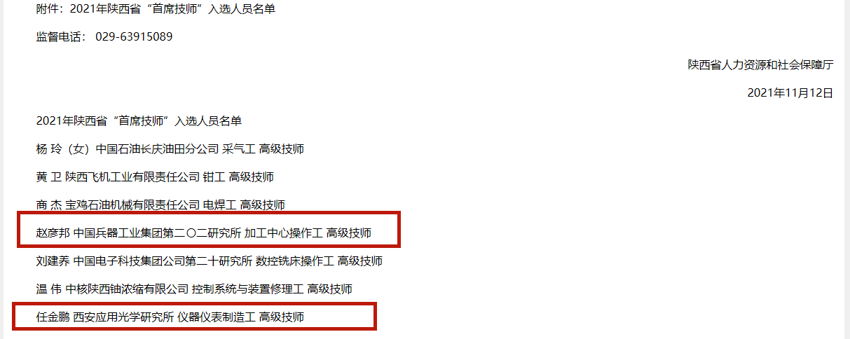 近日,从陕西省人力资源和社会保障厅获悉,根据《中共陕西省委办公厅、陕西省人民政府办公厅关于印发〈陕西省“三秦工匠计划”实施办法〉的通知》(陕办发〔2018〕20号)和《中共陕西省委组织部、陕西省人力资源和社会保障厅、陕西省总工会关于推荐申报2021年陕西省“首席技师”的通知》(陕人社函〔2021〕327号)。经各地、各部门申报,专家评审,杨玲等40名同志为2021年陕西省“首席技师”入选人员。我校校友赵彦邦,任金鹏也入选其中。
