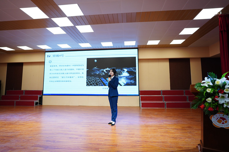 科普报告在主持人樊泽荣“有谁想当宇航员,你知道哪位宇航员吗?”的趣味互动中拉开序幕,随后三位讲解员李雅倩、孙卓玥、王林青紧密结合三年级小学生的知识接收能力与兴趣点,采用通俗易懂的语言,生动活泼的形式,相继为同学们介绍了嫦娥4号、天问1号火星探测器和中国空间站的科普知识。