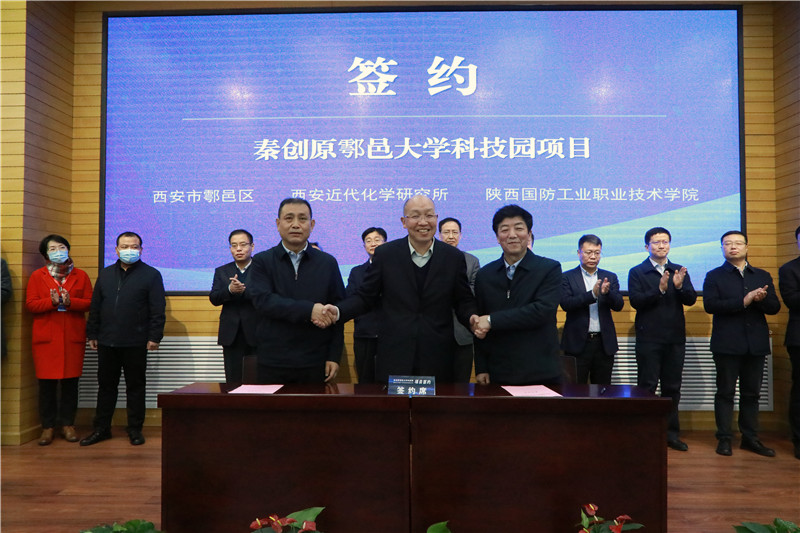 鄠邑区副区长毛安、西安近代化学研究所副所长封利民、18新利苹果客户端副校长刘少阳共同签订秦创原鄠邑大学科技园项目协议