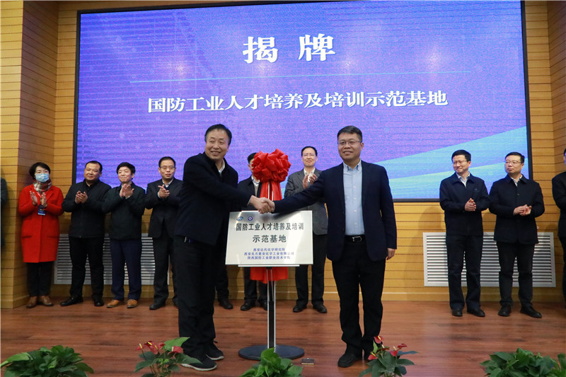 陕西省委军民融合办一级调研员刘建伟与西安市委军民融合办副主任岳智宏为国防工业人才培养及培训示范基地揭牌