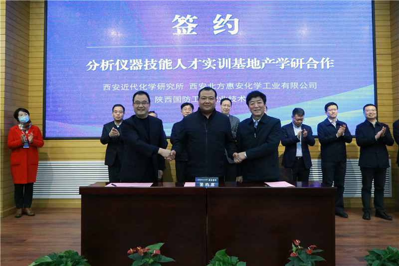 西安近代化学研究所副所长封利民、西安北方惠安化学工业有限公司副总经理张慧忠、18新利苹果客户端副校长张永军共同签订分析仪器技能人才实训基地产学研合作协议