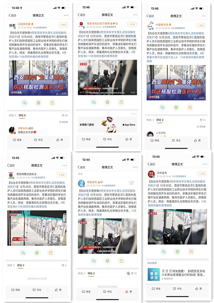 12月20日,西安市鄠邑区济仁医院的医护人员们给我校师生做完核酸检测开车返回的途中,穿着迷彩服的学生们(军魂学社社团成员,退役军人)整齐站在道路两侧,集体向医护人员敬礼,致敬医护人员,用最高的礼仪致敬白衣天使。此事件相关新闻在央视快看、陕西发布、西安网络广播电视台、石家庄广播电视台等多家官方权威媒体平台上发布,引起了良好反响,展现了我校学子的风采,凸显了我校的军工文化育人特色,提高了我校的知名度和美誉度。