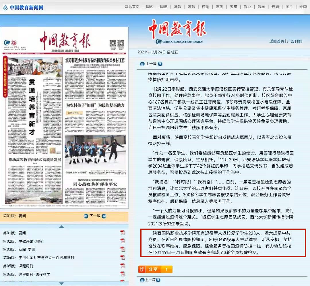 2021年12月24日,中国教育报头版刊登了关于我校学生抗疫的事迹,受到了广泛关注。原文如下: