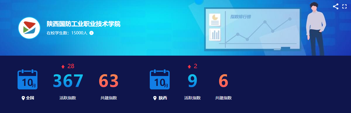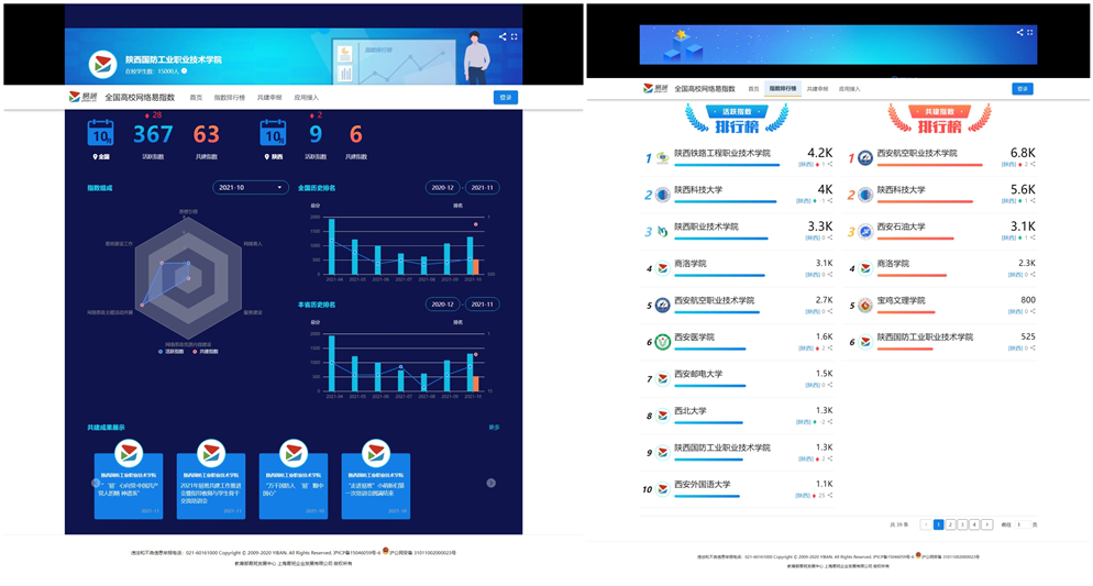 近日,教育部易班发展中心大数据平台公布了2021年10月陕西共建高校“双指数”排行榜单,我校共建指数实现历史性零的突破,荣登全省第6名,名列全国第63名;活跃指数较9月有所攀升,全省提高2位至第9名,全国提高28位至第367名。
