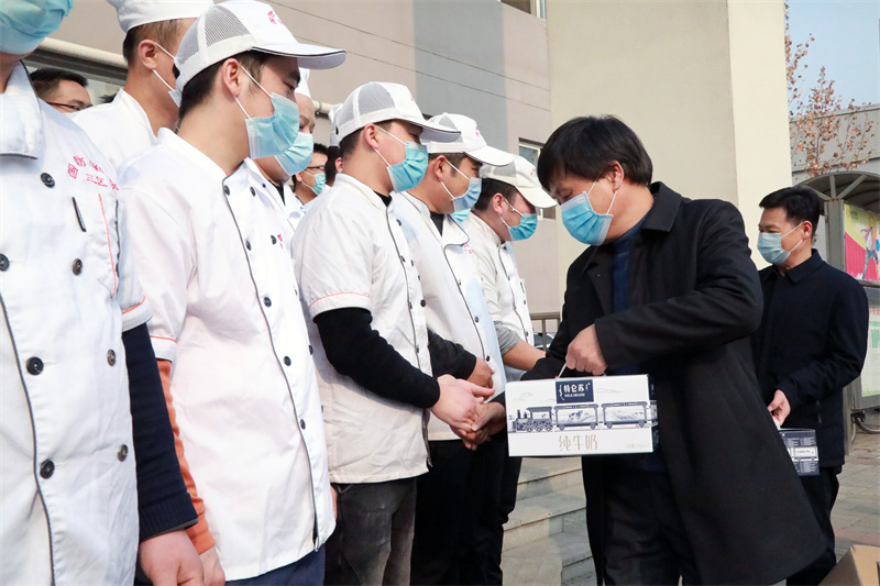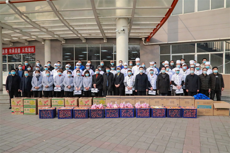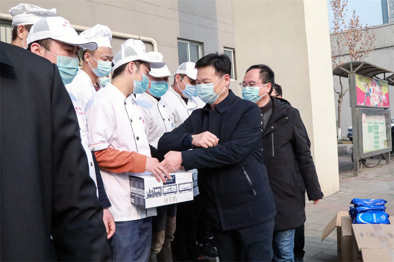 12月24日下午,党委书记张卫平、校长刘敏涵、党委副书记杨聪、副校长张永军等校领导一行在党政办、宣传部、后勤处等有关负责人的陪同下,走访了学校食堂等地慰问工作在一线的食堂、保洁、保卫、医务以及宿舍管理等一线的后勤服务人员,代表学校送去温暖、表达感谢并了解他们疫情期间在学校的生活情况。